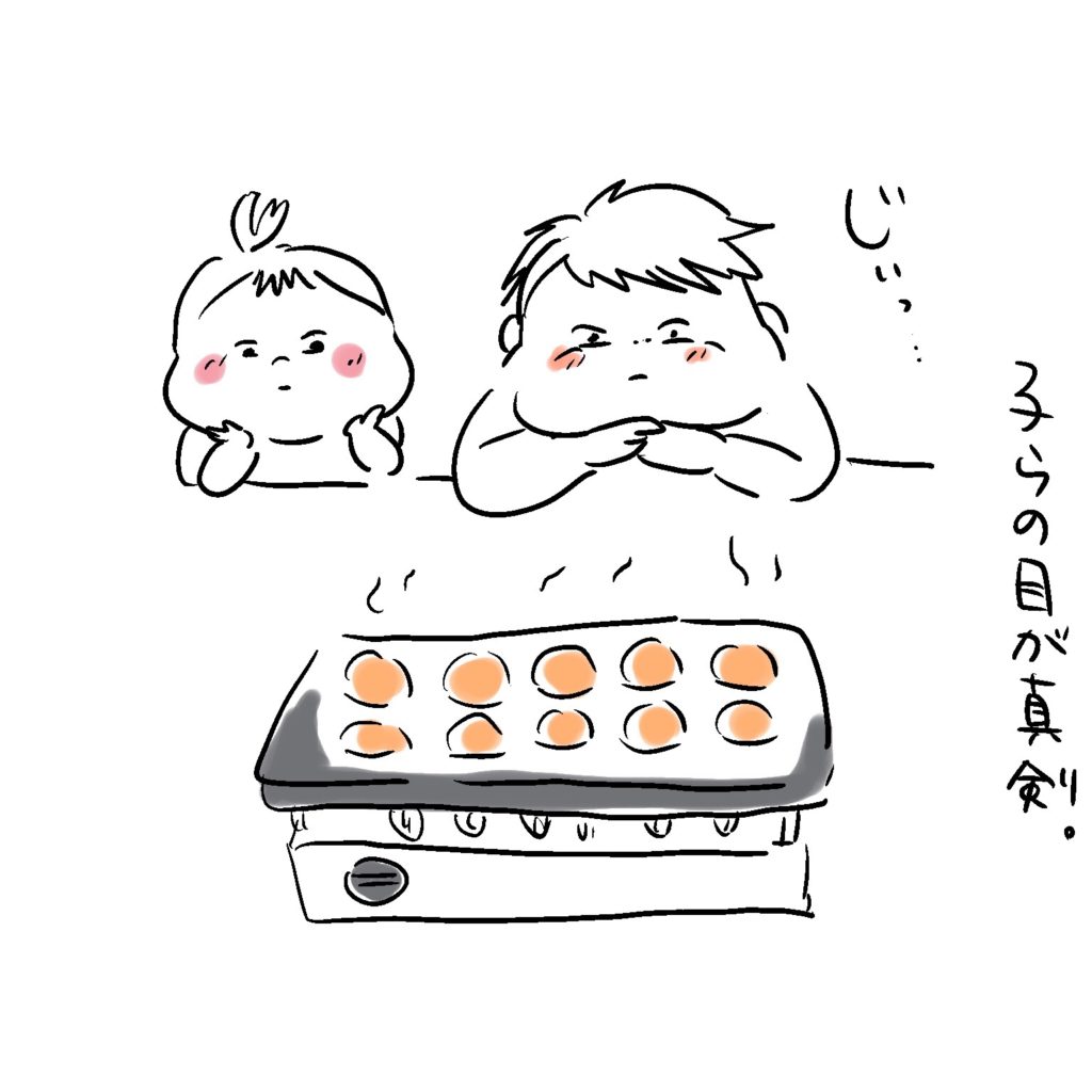焼き上がるのを見つめる目が真剣そのもののふたり。