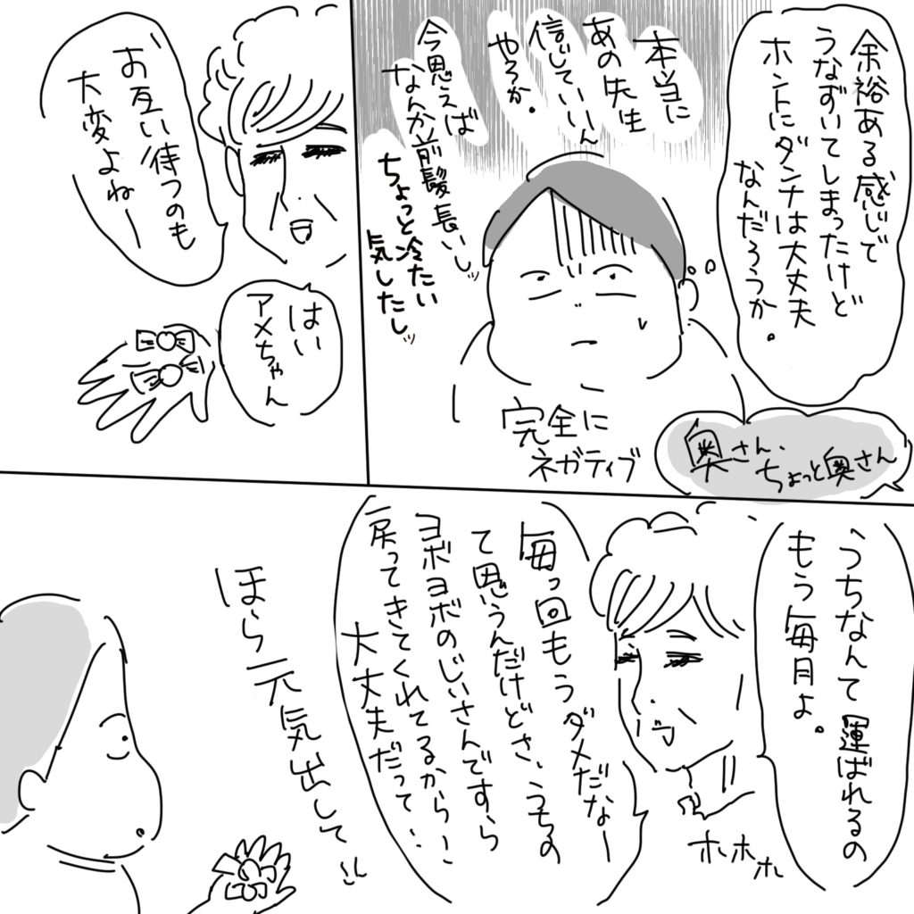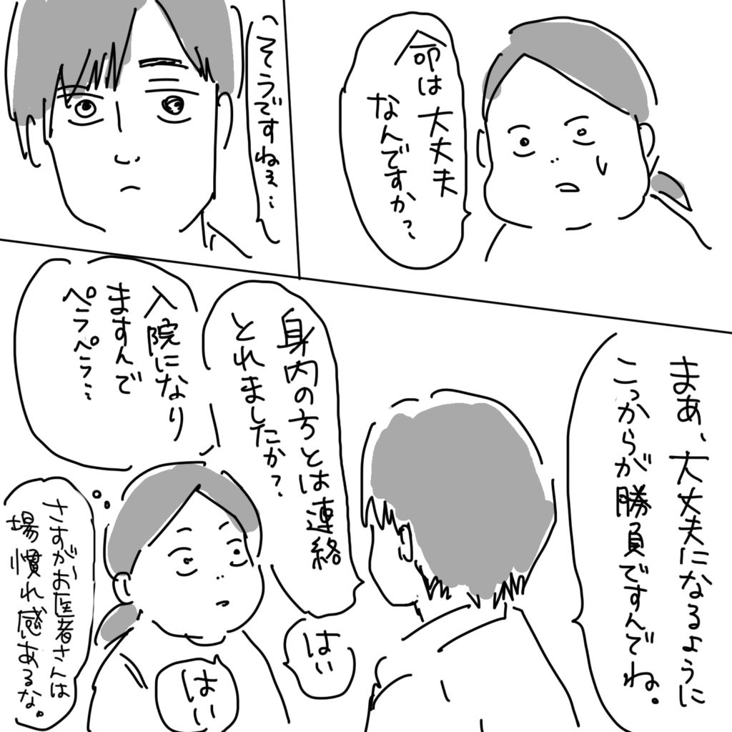突然の出来事 その4 2019年05月24日 続きます。 思いのほか病名を告げられるのがアッサリですごいビックリした。 連絡は身内以外に職場への連絡なんかをした記憶。 気を紛らわせいのもあって、一度病院を出て入院の荷物を取りに戻りたかったけど誰かは必ず待っててって事だったので、ジリジリと旦那の様子を想像しながら立ったり座ったりそこらを息子と散歩したり。 飴をくださった上品な奥様、私がどえらい顔してたのを見かねてくださったんだろな…ありがたい!【この話の続き】 前回◀︎ ‖ ▶︎次回↓LINEで更新通知が受け取れます! 「健康問題」カテゴリの最新記事 タグ :#脳梗塞 < 前の記事次の記事 > コメント コメント一覧 (4) 1. しほ 2019年03月18日 18:17 脳梗塞…!想像以上に、重症だったんですね… 動かさなかったのと 素早く、救急車を呼んだのが 本当に 良かった気がします。誰しもが いつ倒れるか 本当に、怖いですね… 0 aneeejya がしました 2. megumi.yamamori 2019年03月18日 19:22 しほさん 健康に気をつけてても、いつ何があるかわからない…ということをほんと身をもって知りました…。とはいえ、しほさんもお互い健康にはきをつけていきましょうね! 0 aneeejya がしました 3. うめ 2019年03月18日 19:27 旦那が医師です。私は看護師でもなんでもない素人です。帰宅したあと仕事の話を聞くとどんなに重症患者さんの事や、大変な処置のことでも淡々と話したり、余命や亡くなるまでの日数を冷静に考えて自分のスケジュール組んだりしています。最初は冷たいなと思いましたが、自分が不安げにしていたりすると患者さん家族を余計不安にさせますし一人一人に心を持ってかれ過ぎると働けないようです。旦那さんの件、救急車間に合ってよかったです。 0 aneeejya がしました 4. megumi.yamamori 2019年03月18日 20:00 うめさん この先生はこの先も出てきますが、この淡々とした感じでいてくれたから良かったなと思ってるんです。 そう思えるようになったのは落ち着いてからですけども。笑 なんにせよほんと大変な素晴らしいお仕事だなと思いました。 当時のことを思い出すたび感謝の気持ちでいっぱいです。 うめさんのご主人もクールに誠実に今もどこかで誰かを助けてらっしゃるんだろうなあ。 内情を教えてくださってありがとうございます。 0 aneeejya がしました コメントフォーム 名前 コメント 記事の評価 リセット リセット 顔 星 情報を記憶 コメントを投稿する
