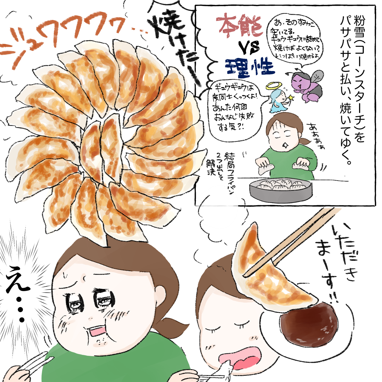 もしかして餃子をのせているお皿はミスドさんのお皿ですか?あの大きさが餃子をフライパンからお皿にひっくり返す時にとても便利ですよね!