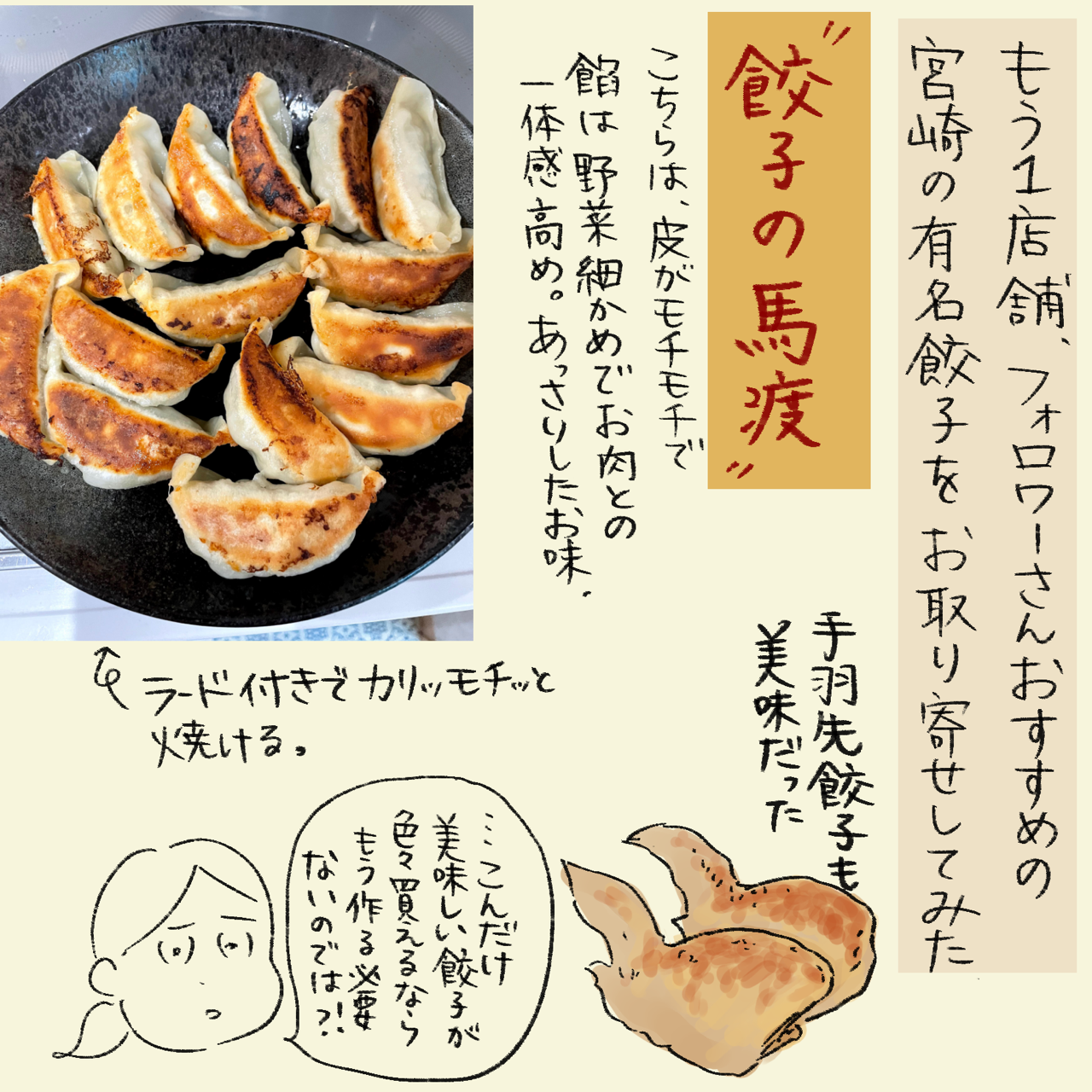 宮崎の餃子ですが、馬渡さんと同じ高鍋で有名な「たかなべ餃子」もオススメすぎますよ!