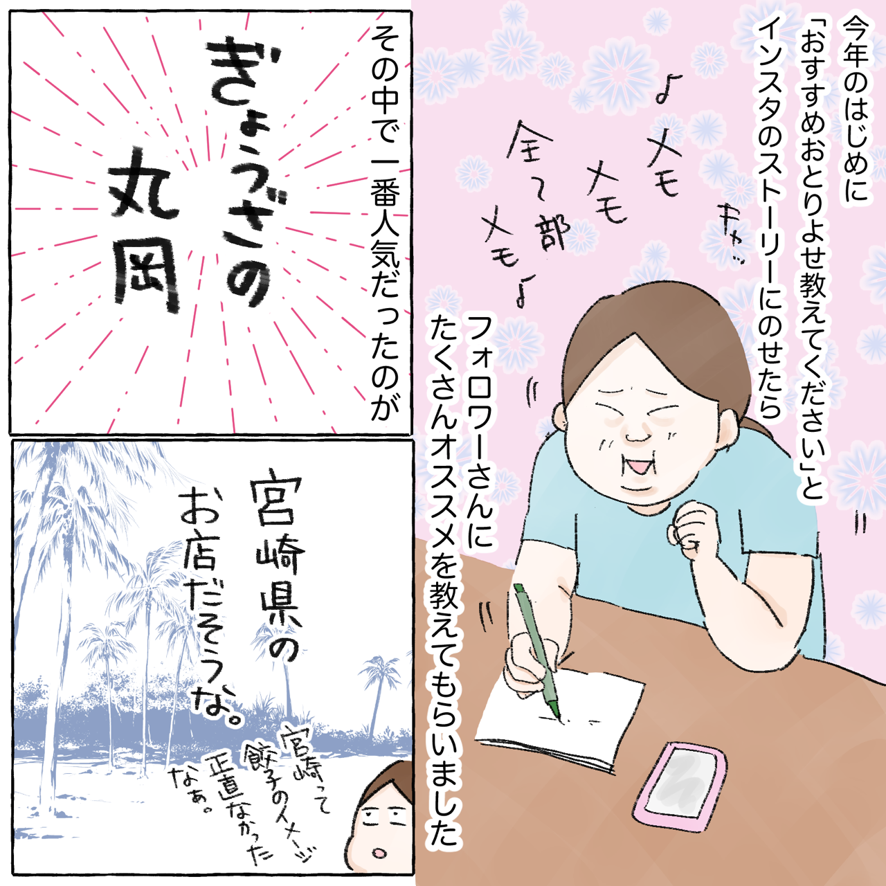 他県から嫁いできたんですが、私も宮崎の餃子文化がこんなに盛んだって全然知らず。黄楊の餃子を初めて食べた日に「嫁に来てよかった2位」と旦那にお知らせしました。