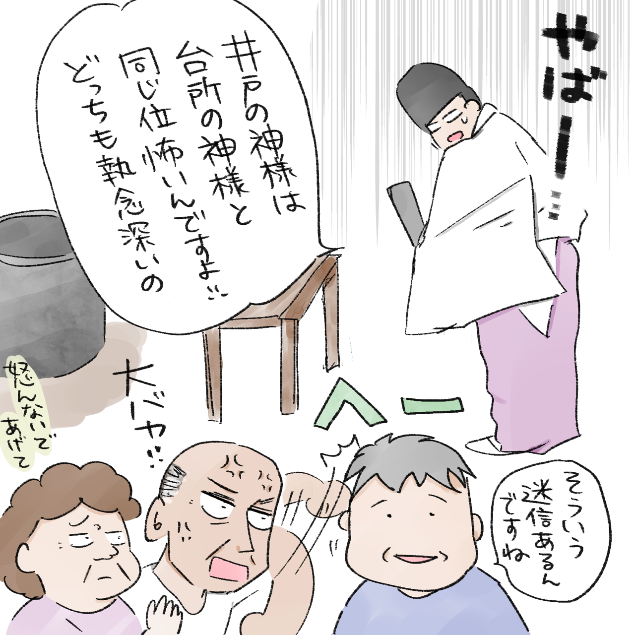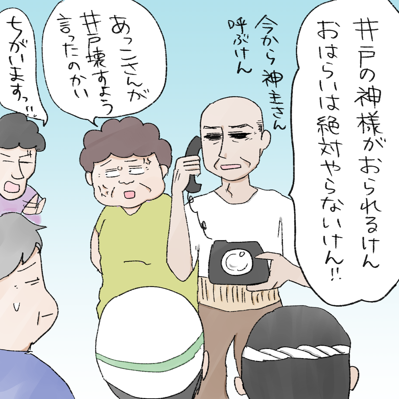 神様の怒りにふれるので、何があってもご祈祷してから井戸は埋め戻さないといけないらしい。