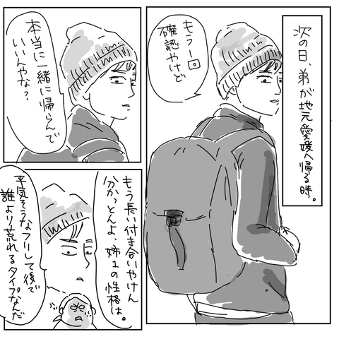 いろいろ起こりすぎる。一気に不動産のクロダさんが怪しい気がしてきた。即決でホイホイ決めるダンナも正気じゃない気がする。そんななか、弟の放つ一言。「まあでも、帰った方が後悔ないかもしれんよ。お母さん(リツコ)の事もあるし。」何それ。入院しとるて言