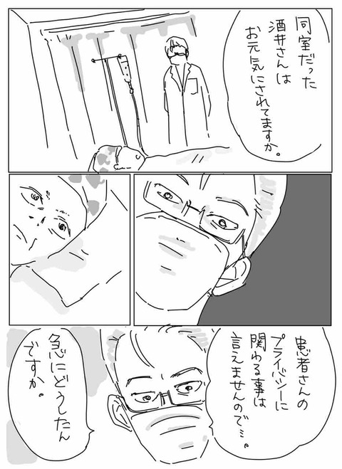 悲しい噂。四人部屋の仲間、明るく前向きだった酒井さん。ショックな話を聞いたこの頃から体調が崩れ、気分が塞ぎがちになったそうです。次回に続きます。【この話の続き】前回◀︎ ‖ ▶︎次回↓LINEで更新通知が受け取れます!