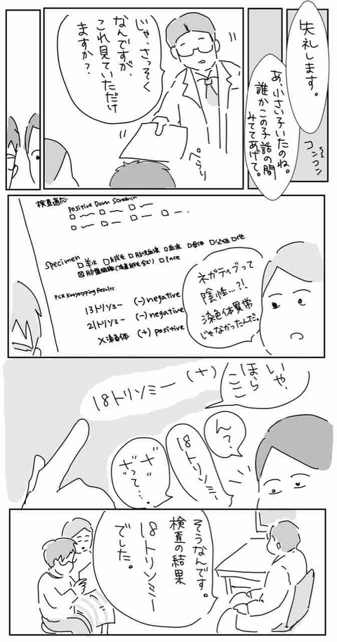 覚悟はしてたけど…。不思議に低い耳の位置、重なった指の感じ。やっぱりなという気持ちと、呆然とした気持ちとのせめぎあい。見せてもらった検査の用紙、18トリソミーだけ別の段になってて最初目に入らなかった。ほら、ここ。って指摘されて、石を飲んだような感じというか
