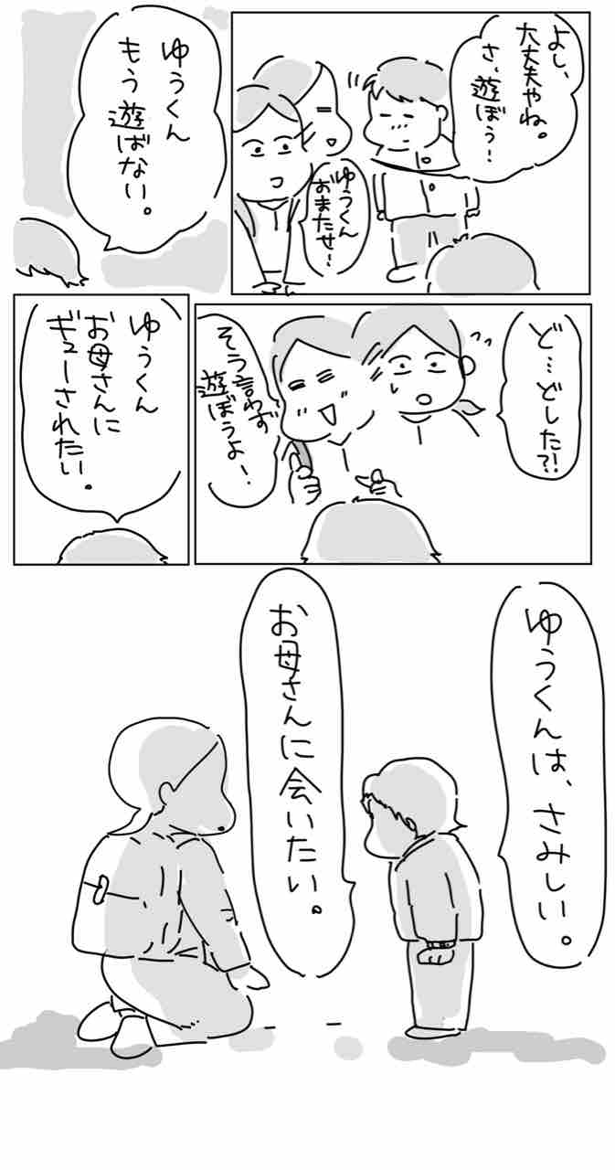 静かに泣くゆうくんに心の中で「ほんとのお母さんじゃなくてごめん。」と言いながら、ただギュッとするだけしか出来なかった。