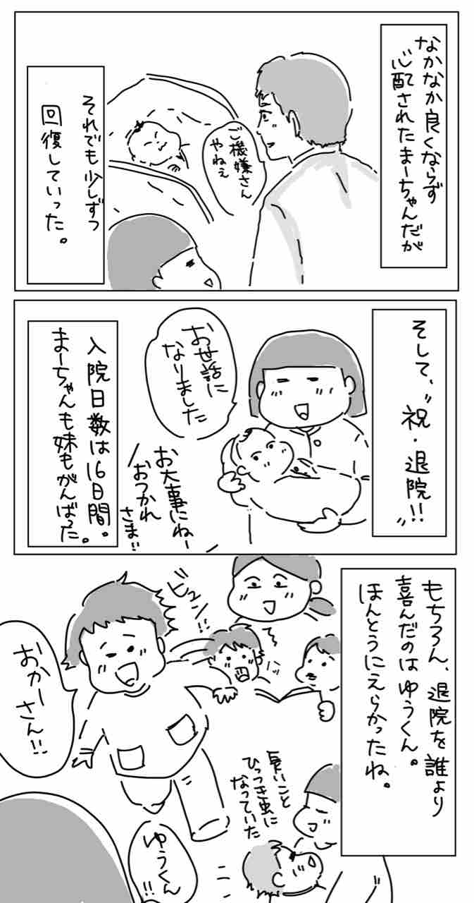 まーちゃんも妹さんも頑張りましたね。お兄ちゃんも家でお母さんと会えてとても嬉しかったのが伝わってきました。本当に退院おめでとうございました(о´∀`о)