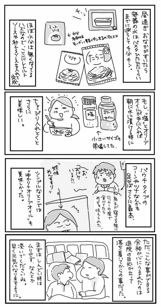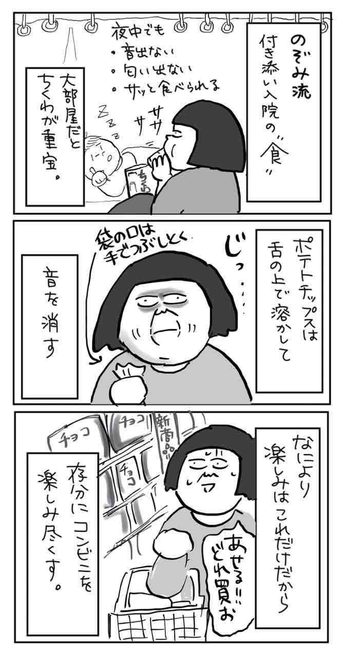 付き添い入院って夜中の巡回や検温で目が覚めたり、自分のお風呂やトイレにも中々行けないし、もちろん買い物にも行けないし、点滴が本人がよく動くからかピーピーエラー出しちゃうし、子も邪魔でぐずるしで大変だった。