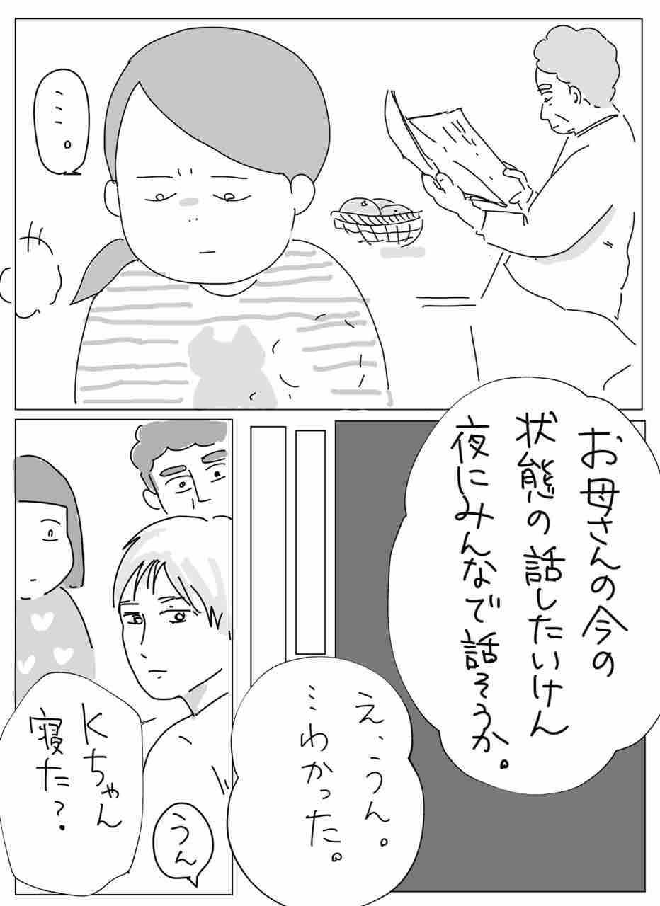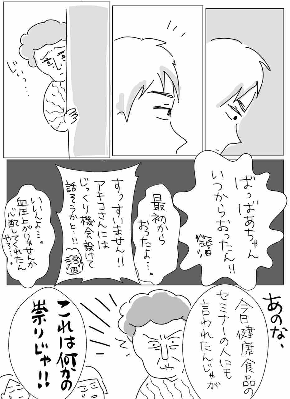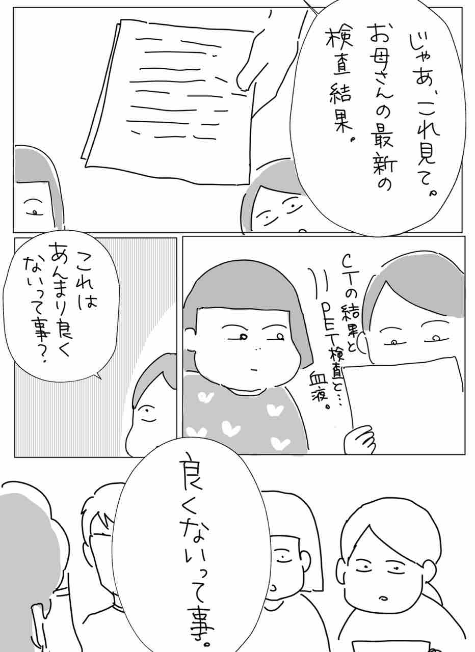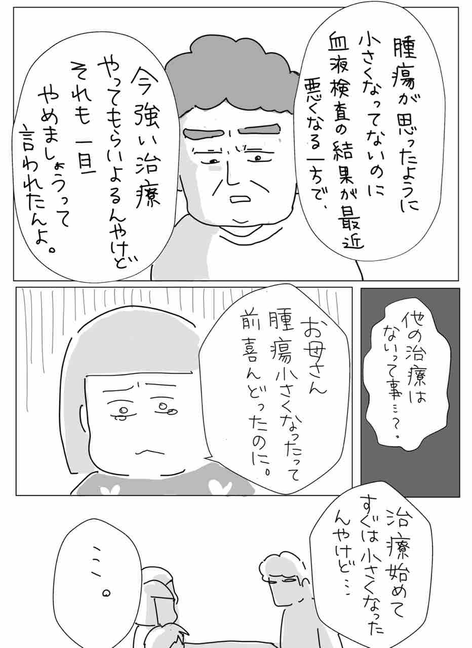 悪性リンパ腫入院編 その13 2020年07月17日 母の治療が一旦お休みになってしまった。ショックでみんな黙り込んでしまった。そんな時ばあちゃん陰から登場。ばあちゃんは昔から信仰心が篤くて、人の言うことは全部信じちゃう方だけど、こんな色々起きた時だからなおさらその健康セミナーの人の言葉を固く信じちゃってるようだった。(知ってる人は知ってると思うけど、私もそういうのは全然否定派じゃなく色んな不思議なことは起きるもんだと思う派です。けど、続きで語るけど今回はちょっと不信感…。)【この話の続き】前回◀︎ ‖ ▶︎次回↓LINEで更新通知が受け取れます! 「健康問題」カテゴリの最新記事 タグ :#悪性リンパ腫#帰省#検査結果 < 前の記事次の記事 > コメント コメント一覧 (7) 1. ぶぅ 2020年07月17日 21:38 めぐちゃん、最後のコマの「たたり」の字が間違ってます💦💦 0 aneeejya がしました 2. 山森めぐみ 2020年07月17日 21:40 >>1おおおーー!ありがとう!後でこっそり直してくるね🙏🙏 0 aneeejya がしました 4. ぶぅ 2020年07月17日 22:37 >>2 よかった😂 うちのダンナが「崇」なんですけど「祟」って間違われたことがあって(笑)しかも問い合わせた結婚式場からの手紙🤣🤣 0 aneeejya がしました 7. 山森めぐみ 2020年07月17日 23:14 >>4ヤダーごめんダンナさんーー😭 清水崇監督好きなくせに間違っちゃってゴメンよ〜! 結婚式場の手紙間違われるのはヤバいね🦹♀️ うちのじいさんは名前に 基 が入るんだけど、頻繁に 墓 に間違われてたことをなんか思い出したよ🤯 0 aneeejya がしました 3. のこぴ 2020年07月17日 22:33 めぐちゃんこんばんは! のんちゃんにお世話になりました(?)になってるのこぴです! 実はうちの父も先月リンパ腫が見つかって治療中です… 濾胞性リンパ腫っていう、進行遅いやつなので、ステージ4やったけど命に関わることじゃなかったけど… ちょうど検査あたりにめぐちゃんの漫画読んでて胸いっぱいになってました😭 いつまでも元気でいてほしいですよね。ほんとに… 0 aneeejya がしました 6. 山森めぐみ 2020年07月17日 23:12 >>3のこぴちゃん その節はのんちゃんがありがとう! そしていつも読んでくれてありがとうね✨ お父さん…命にかかわることじゃないならよかったけど、本当にみんな不安な日々やったろうなあ。 胸が詰まるよ。 命に関わらんとはいえ、進行がずーーーっとずーーーーーーーーっと進まず、なんなら消えてくれることを心から祈るよ。 のこぴちゃんも大変だけど、いっぱい食べていっぱい寝てね。 元気でいつか会おうね! 0 aneeejya がしました 5. Ns 2020年07月17日 22:58 ごめんなさい、間違えて1つ前の記事に長々としたコメント送ってしまいました! 0 aneeejya がしました コメントフォーム 名前 コメント 記事の評価 リセット リセット 顔 星 情報を記憶 コメントを投稿する