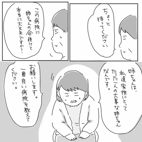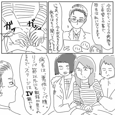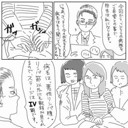 ついに病名の告知。通された部屋には形成外科・乳腺外科・血液内科の先生が集まっていた。一番心配していた乳ガンではないという喜びのつかの間、ガンですよ。と教えられ、立て続けに早くこの病院で治療を…と勧められた。そんな中、妹ユリさんが口を開いた。【この話の続き