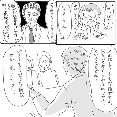 こうして紹介状は書いてもらえることになったのだった。関わった医者が全員珍種の珍しい病院ともこれでオサラバ。それにしても絶対謝らないのはなんでなんかな。訴訟とか怖いからかな。そんでも逆にちゃんと謝らない事で怒りがおさまらなくて訴訟になる事もあるんじゃないか
